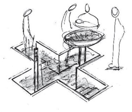 O átrio – O átrio dá ideia de passagem, de limiar entre o conhecido e o desconhecido, entre a luz e as trevas. É o lugar que prepara para o mistério e convida para entrar. É simbolicamente o umbral entre o caos e a ordem. Aí se desenvolve o ministério da acolhida.